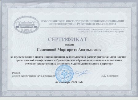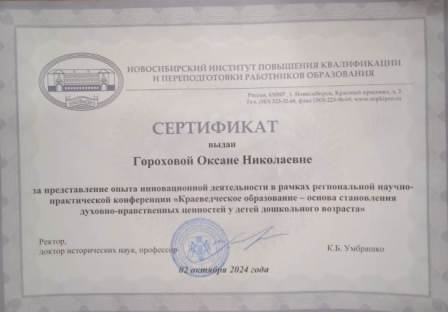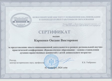 Семенова Маргарита Анатольевна (воспитатель высшей квалификационной категории) выступила с докладом «Эколого-краеведческое образование дошкольников через различные форма работы в процессе ознакомления с природой Новосибирской области». А воспитатели Карпенко Оксана Викторовна (воспитатель высшей квалификационной категории) и Горохова Оксана Николаевна (воспитатель высшей квалификационной категории) представили опыт инновационной деятельности по теме «Конкурс "Краеведик" как одна из эффективных форм краеведческого образования дошкольников родного края». Мы все получили для себя не только большой опыт, но и новые идеи реализации программы. В завершение работы организаторы и участники конференции поблагодарили выступающих за интересные выступления, возможность получить ответы на интересующие вопросы. Каждый выступающий получил сертификат НИПКиПРО за презентацию и видеофильм своей работы.