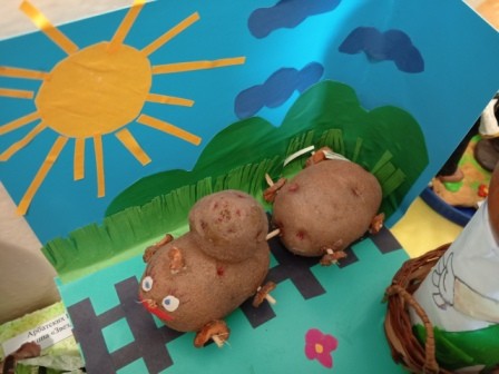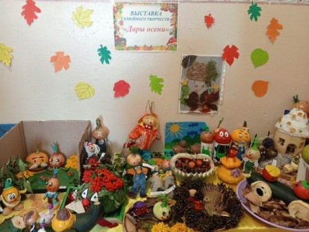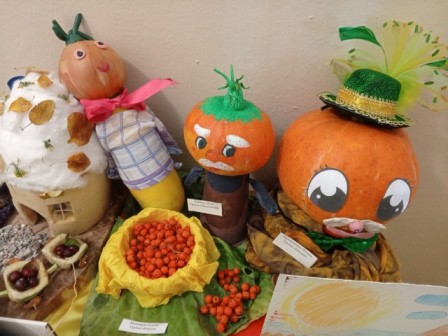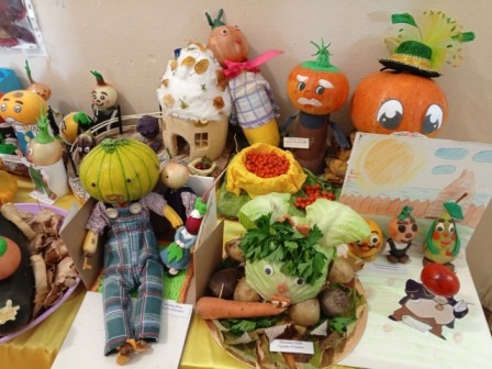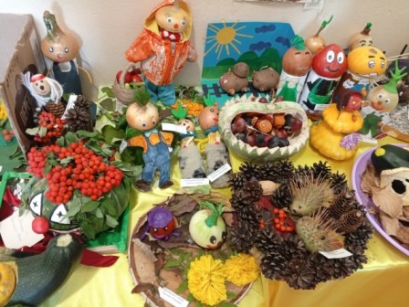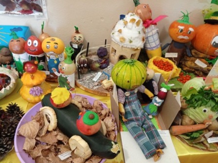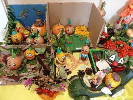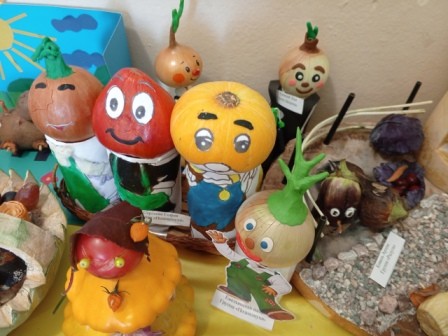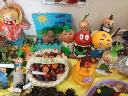 В детском саду «Солнышко» прошла традиционная ежегодная выставка "Дары осени". На выставке было представлено очень много интересных композиций. Большая часть ярких и разнообразных поделок посвящена героям произведения Джанни Родари «Приключения Чиполлино». Поделки из фруктов, овощей, шишек, листьев, цветов поражают и заставляют восхищаться фантазией и талантом детей и их родителей. Много труда и творчества вложили они в свои оригинальные, необычные и красивые работы.