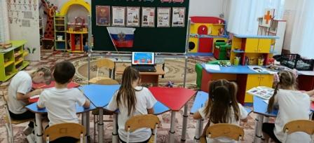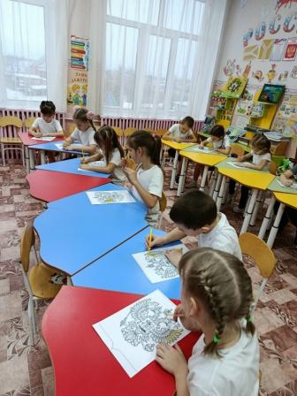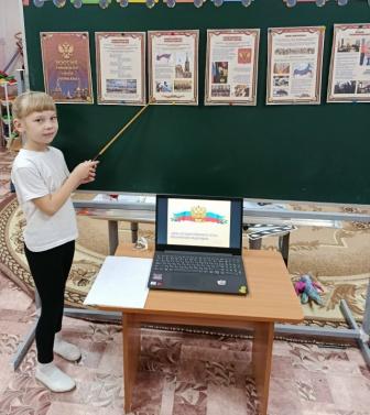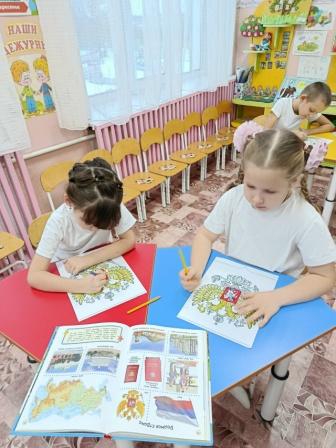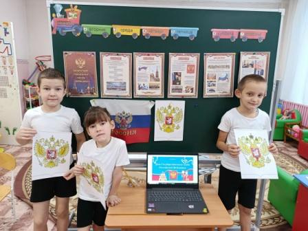 В подготовительной группе «Радуга» с ребятами провели беседу с показом познавательной презентации «Один герб – одна Россия», с целью расширить знания об истории появления Государственного герба и значимости для нашего государства. Поиграли в дидактические игры «Найди герб нашего государства», «О чем расскажет герб?». Ребята проявили свою фантазию и творчество в продуктивной деятельности – раскрасили герб нашей Родины России. Дети со своими творческими рисунками пришли к малышам младшей группы «Сказка», где показали и рассказали все то, что сами узнали нового о гербе РФ. Они подарили младшим ребятам свои творческие работы.