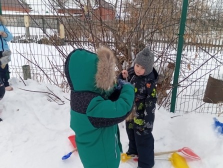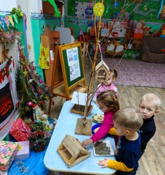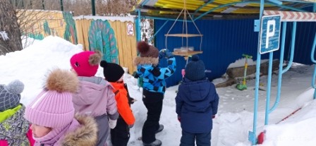 На прогулках дети определили место для своей кормушки. Повесили и наблюдали за появлением птиц. В глазах детей был такой восторг, когда прилетели первые пернатые друзья.
