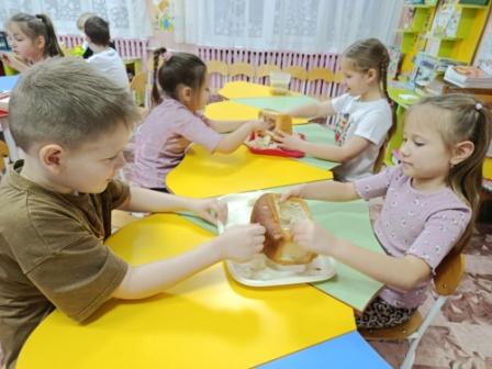 Ребята всех групп предложили изготовить «съедобные» кормушки. Вместе с воспитателями они приготовили все необходимые материалы – хлеб, мука, вода, жгут, зерновая смесь и приступили к творческой деятельности. Из хлеба вырезали окошечки, извлекли мякиш, обмакнули в клейстер, сделанный из воды и муки, и обсыпали зерновой смесью. Далее, привязали тонкий жгут в качестве петельки и положили внутрь кормушки лакомства для птиц. «Съедобная» кормушка была готова.