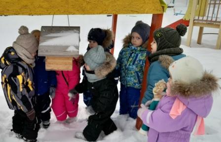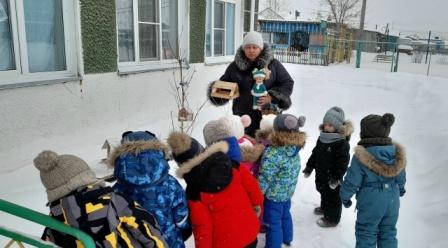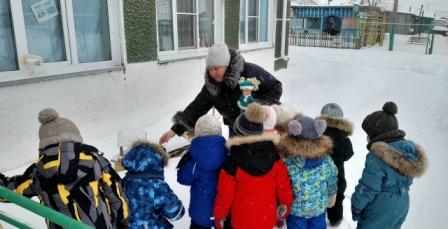 Зимняя прогулка – это не только возможность подышать свежим воздухом, но и отличный момент для знакомства с природой. Во время одной из прогулок кукла Маша пригласила ребят группы "Сказка» покормить птиц на своем участке. Малыши вооружились семенами, крошками хлеба и пошли на улицу, чтобы угостить пернатых друзей. Вместе с Машей они рассмотрели какие есть кормушки на участке детского сада. Затем отправились на свою площадку, где наполнили кормушки. Покормив птиц, дети с куклой поиграли в подвижные игры «Воробушки и автомобиль» и «Попрыгайте, как птички». Подкормка птиц в холодное время года имеет большое значение – природа обделена едой, а пернатые нуждаются в дополнительном питании для выживания.