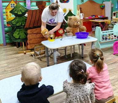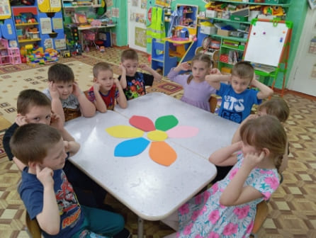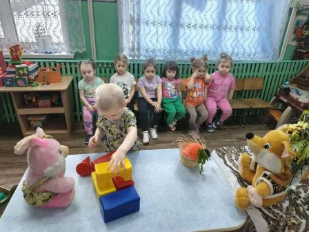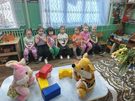 Группа «Пчелки» с воспитателем Райхерт С.Г. обыгрывали сказку «Заюшкина избушка» и играли в игры «Назови ласково» и «Доброе сердечко». На занятии
